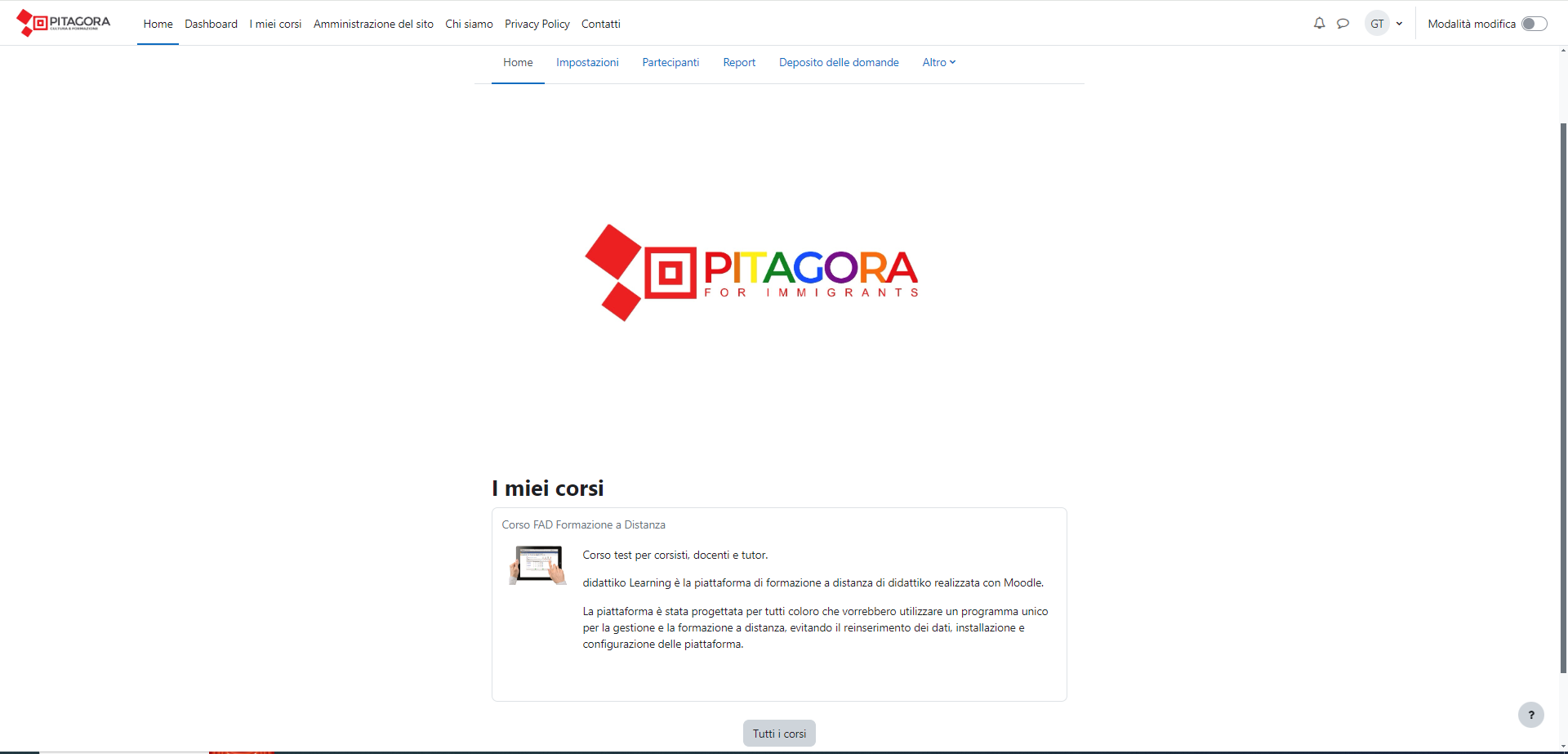 PIATTAFORMA MOODLE PROGETTATA IN PHP, PER RENDERE SEMPLICE IL PERCORSO DELLA FORMAZIONE A DISTANZA, UNA VOLTA ISCRITTO AVRAI A DISPOSIZIONE I CORSI CON LE VIDEOLEZIONI PROGRAMMATE, IL MATERIALE DIDATTICO E TEST DI VALUTAZIONI CON DOCENTI E TUTORI PRONTI PER TE.